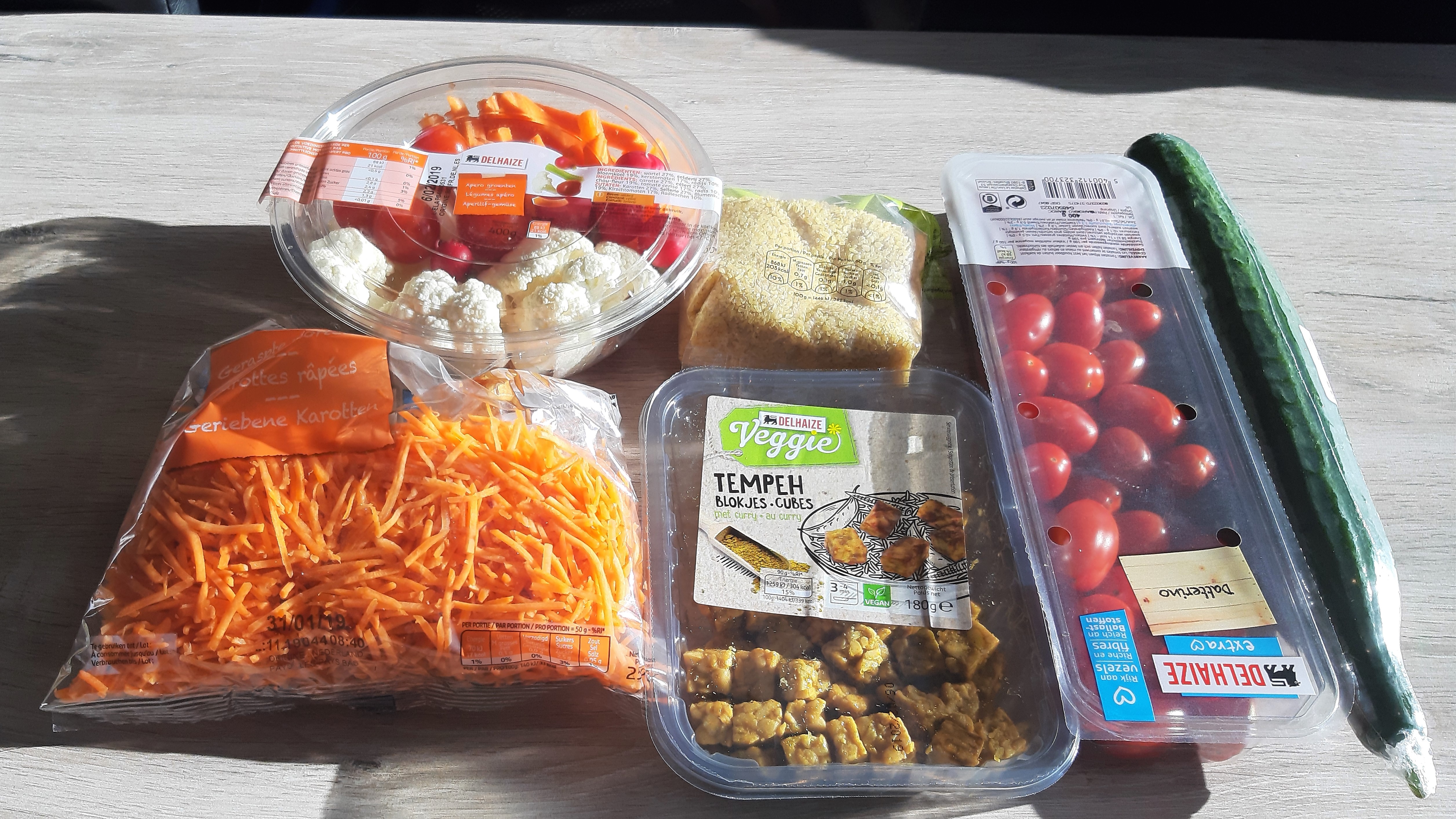 Nu kan je beginnen met de samenstelling. Met een vork maak je de bulgur los en waarna je die in een kommetje of container schept, samen met de groentjes en de tempeh. Doe er een drietal theelepels van de dressing over.