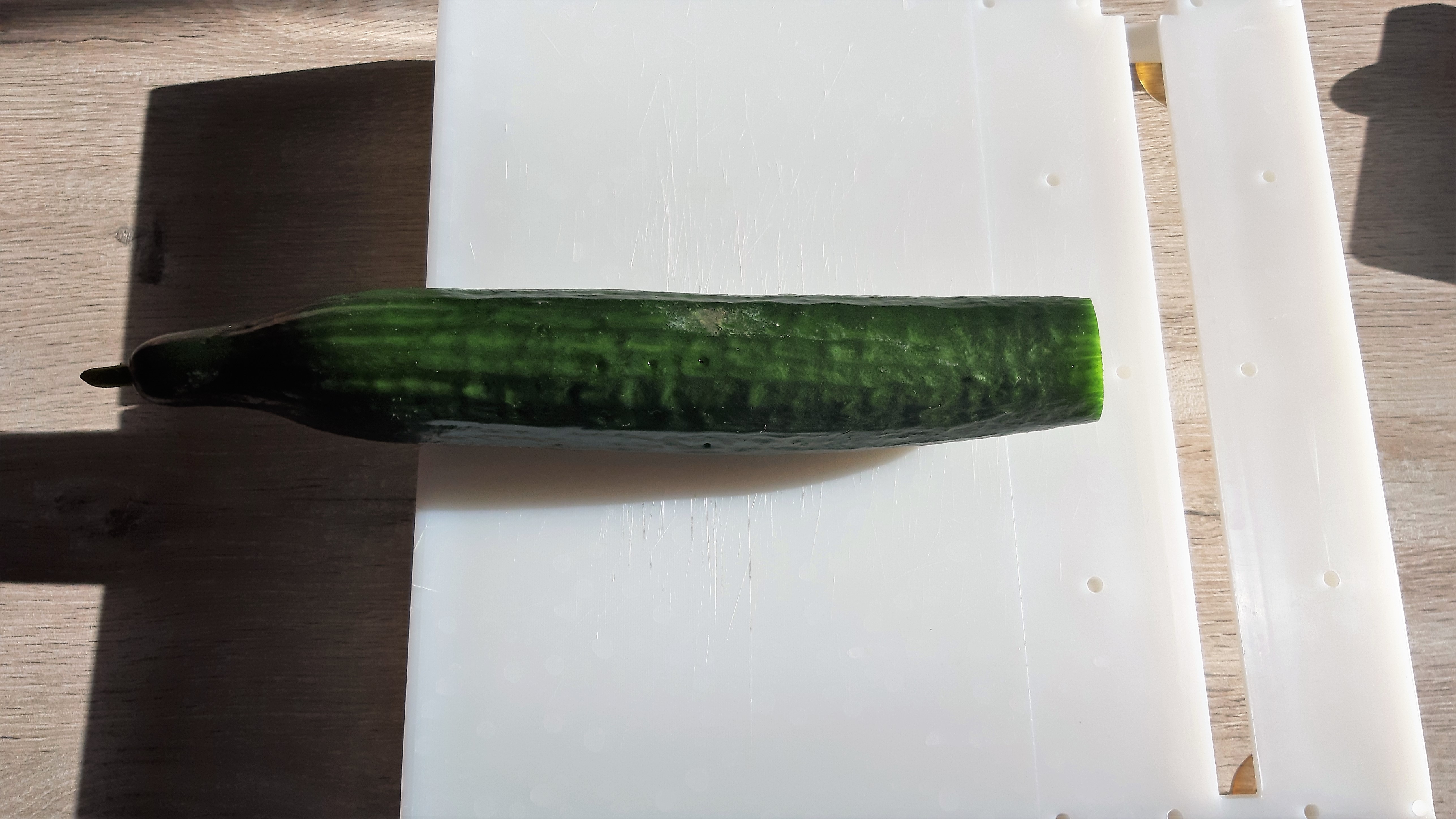 De komkommers snij je overlangs door, door ze op de snijplank te prikken. Dan prik je de komkommer weer vast op de snijplank en snij je ze nog eens overlangs door. Zonder ze terug van de snijplank te halen, kan je er nu partjes van snijden.