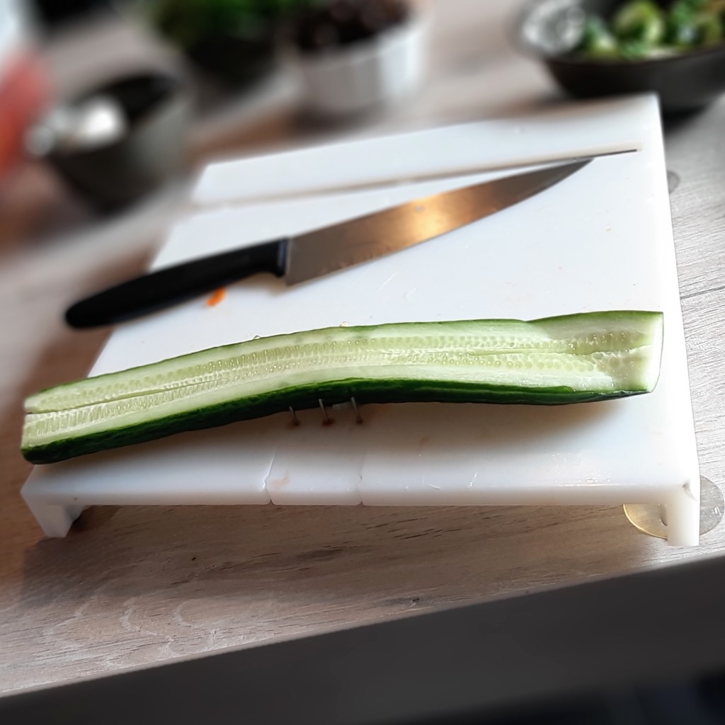 Als je de twee paprika’s hebt gesneden, kan je overgaan naar de komkommer. Die prik je vast op de snijplank en snij je volledig door. Daarna prik je een helft terug op de snijplank en snij je die nog eens volledig door. Die haal je niet van de pinnen, zodat je daar makkelijk partjes van kan snijden.