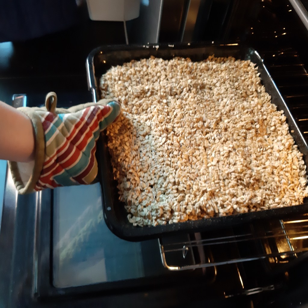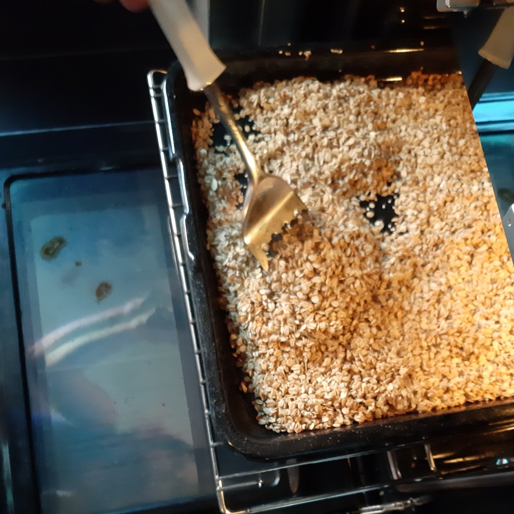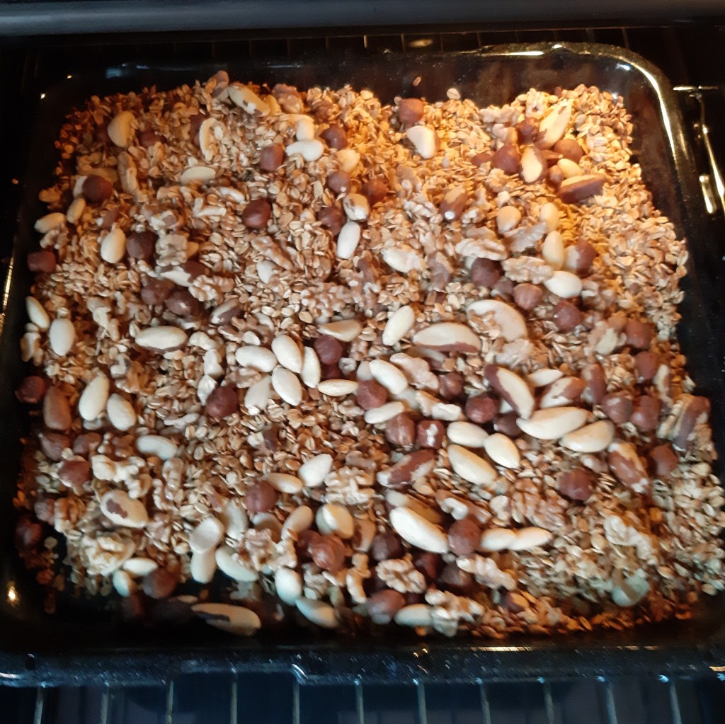 Dus in totaal zitten granola een half uur of 30 minuten in de oven en moet je het elke 10 minuten omroeren. De laatste 10 minuten doe je de noten erbij.