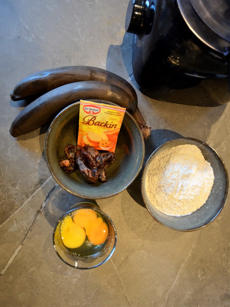 Doe twee van de drie rijpe bananen in stukjes in de blender. Doe daar de ontpitte dadels, de drie eieren, het speltmeel en het bakpoeder bij.