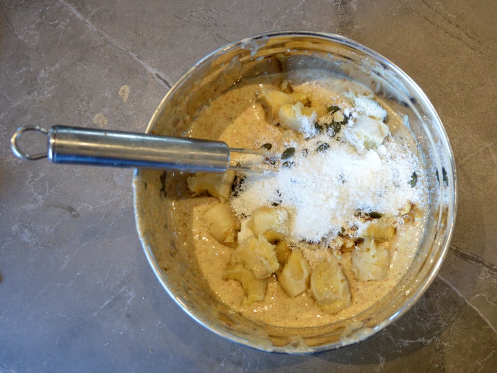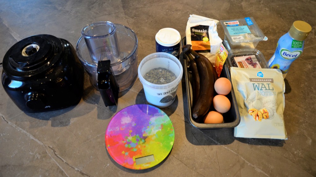 Doe de banaan ook in de kom. Gevolgd door de kokos, de pompoenpitten, de walnoten en het zeezout.