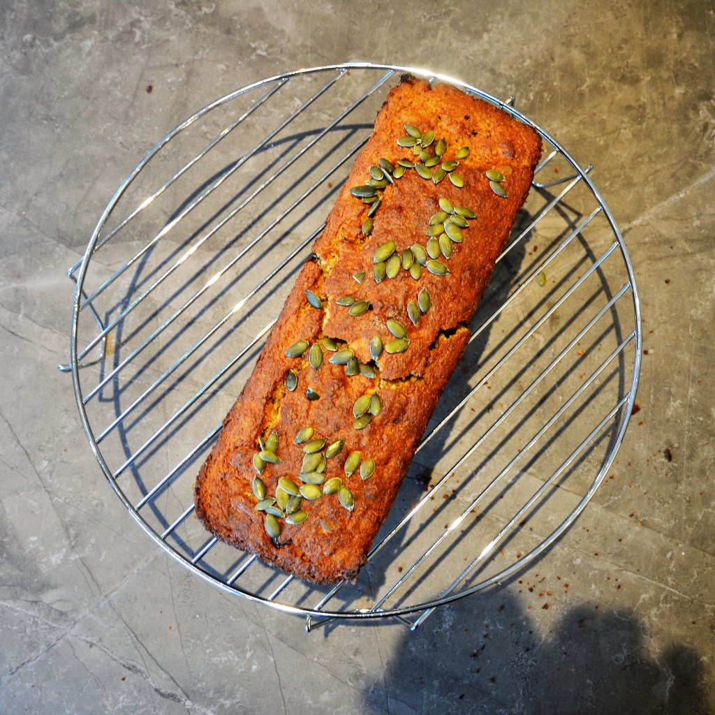Zoals jullie kunnen zien is mijn cake gebroken. Maar dat doet niets af aan de smaak 😉 . Ik heb de cake nog afgewerkt met een paar pompoenpitten op de bovenkant.