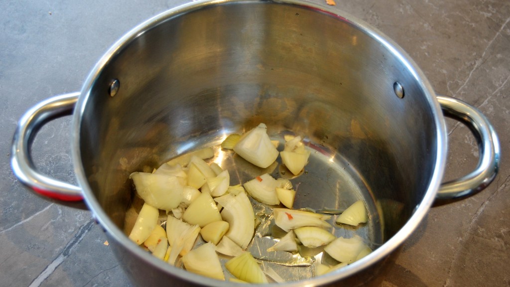 Fruit dan de knoflook en ajuin in een beetje olijfolie, tot ze lichtbruin zijn geworden.