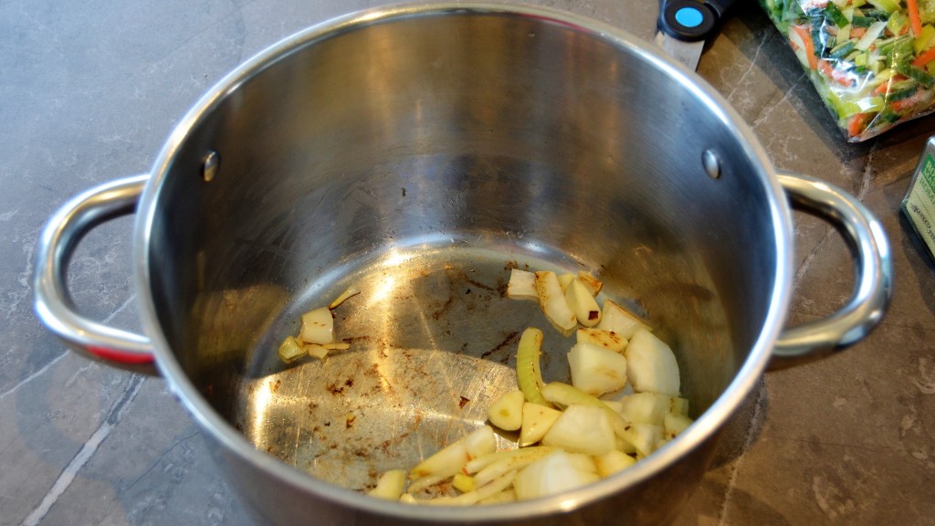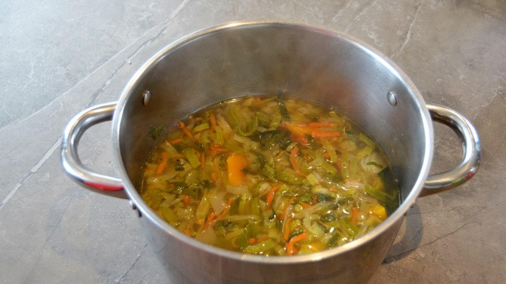 Dit is een van de versies van mijn “luie wijven soep”, zoals dat bij ons gezegd wordt. Gewoon julienne soepgroentenen, die ik ingevroren had en nog wat pompoenblokjes, die ik nog in de diepvries had zitten. Ik heb mijn uien en knoflook zelf gesneden. Je kan dat ook evengoed ingevroren en gesneden kopen. Nog luier 😉