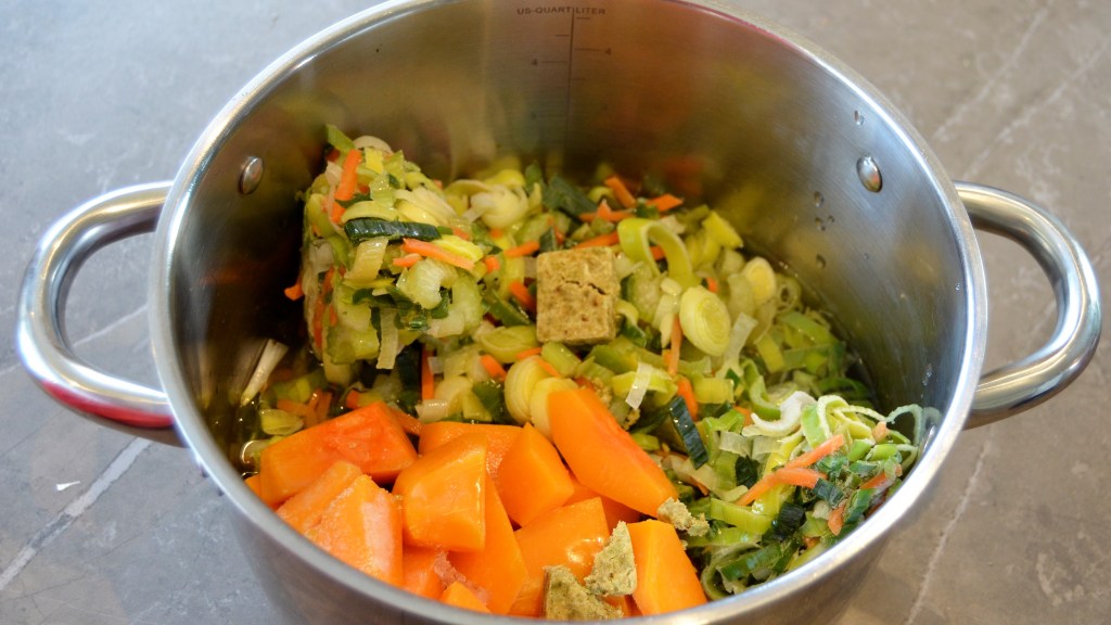 Doe er dan de soepgroenten en de pompoenblokjes bij, gevolgd door minstens 1 liter water en de 2 bouillonblokjes. Je kan er altijd nog meer water bij doen, als de soep naar jouw smaak te dik is. Ik hou wel van een dikke soep 😉