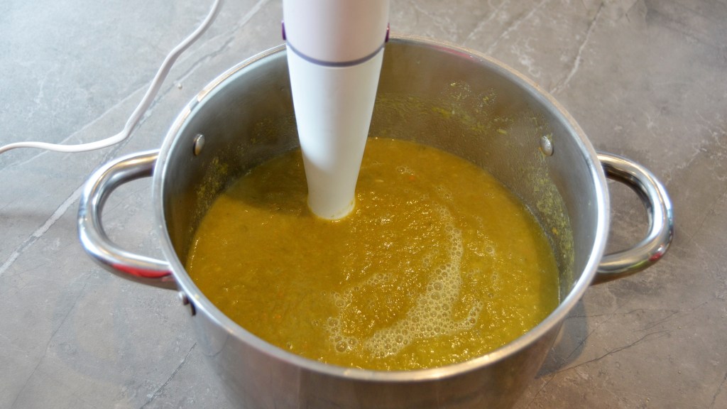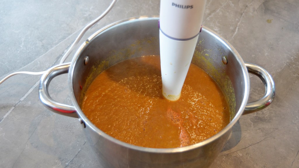 Als de soep 30 minuten door gekookt heeft, haal je de pot van het vuur en mix je de soep. Je kan er ook voor kiezen om de soep eerst laten afkoelen voor je hem mixt.