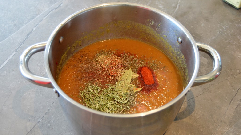 Nu kan je de soep kruiden naar je eigen smaak. Ik heb de volgende kruiden gebruikt: zwarte peper, tijm, rozemarijn, oregano, paprika en laurierblaadjes.