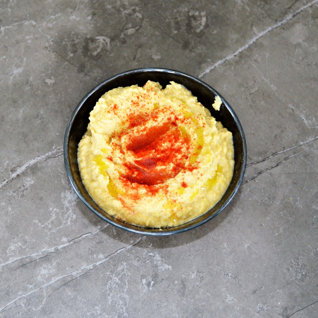 Als je de hummus nog te vast vindt, doe je er gewoon wat extra water bij.