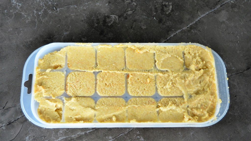 Als je de hummus dan wil invriezen, gebruik je best een ijsblokvorm met deksel. Schep de hummus in de vormpjes en klop er eens mee op je werkblad om de luchtbellen eruit de halen. De hummus houdt minimum 3 maanden bij in de diepvries.