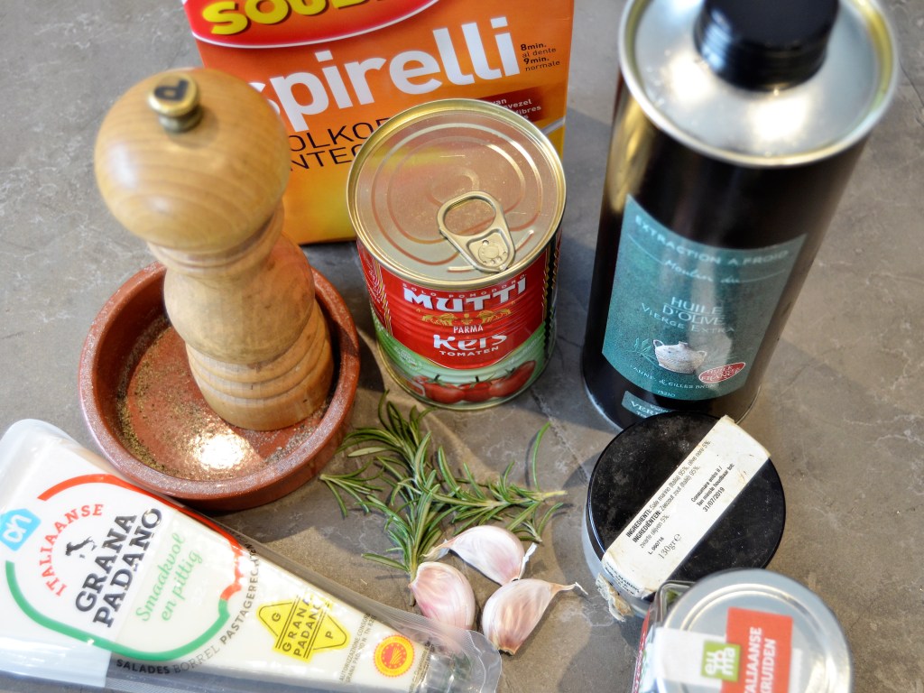 Dus heb ik mijn favoriete go-to recept nog eens gemaakt: Pasta met rozemarijnsaus. De ingrediënten heb ik meestal wel gewoon in mijn voorraadkast en de rozemarijn haal ik uit mijn tuin 😉
