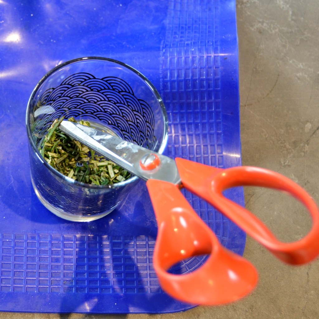 Als de rozemarijn uit je tuin komt, spoel je hem eerst even af. Daarna snij je Rozemarijn fijn. Ik doe dit in een glas met een schaar, of je kan ook altijd een wiegemes gebruiken. Als je gedroogde rozemarijn gebruikt, hoef je die niet af te spelen en niet fijn te snijden.
