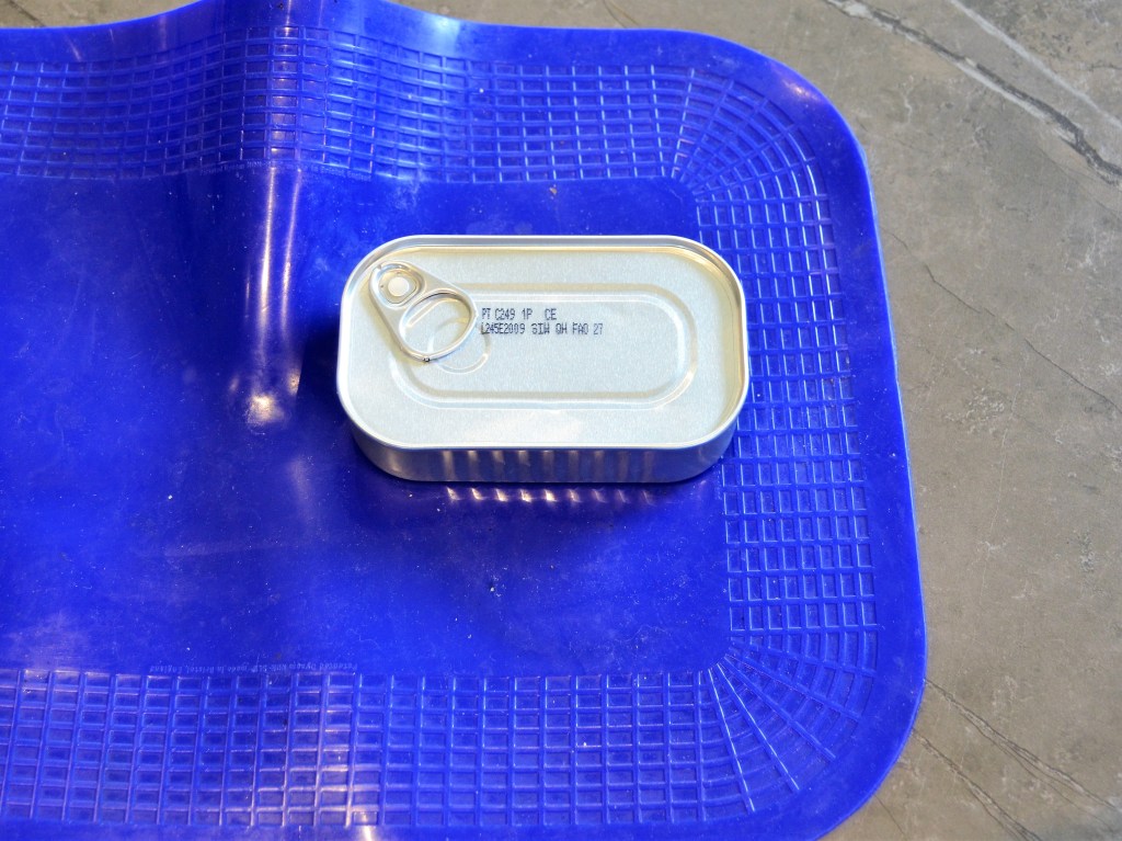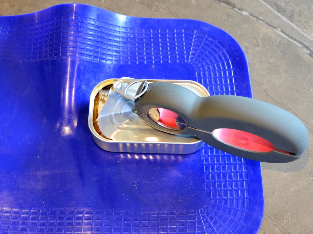 Open het blik met de sardines met de multi opener op een antislipmat. Als het blik niet zo goed wilt open gaan, gebruik je je hand om aan het lipje te trekken. En als je je mindere hand kan iets gebruiken, probeer dan het blikje tegen te houden. Haal de sardines uit het blikje. In het midden van de sardine zit een grote graat. Die kan je eruit halen met je hand, omdat het een redelijk grote graat is.