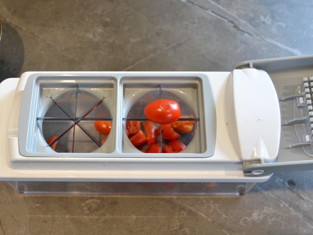 Snijd de kerstomaten in vieren (of in tweeën als het je teveel moeite kost om ze in vieren te snijden 😉 ) Je kan ze eventueel op een snijplank met pinnen prikken, of je kan ze met Nicer Dicer direct in vieren snijden. Ik heb mijn kerstomaten met mijn Nicer Dicer gesneden.