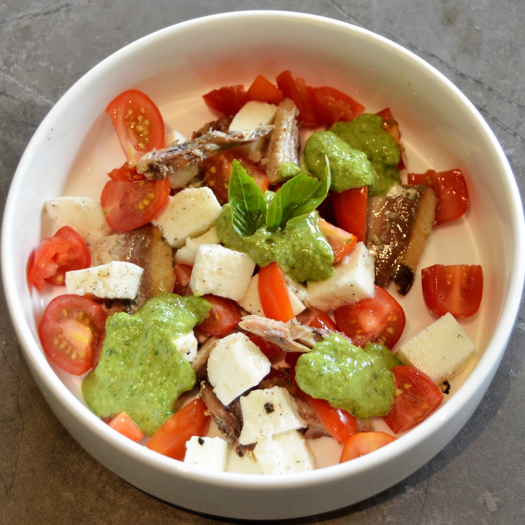 Plaats de ingrediënten mooi op de borden, en werk af met nog 2 blaadjes basilicum per bord. De hoeveelheid pesto kies je zelf. Ik heb ongeveer 5 theelepels per bord gebruikt.