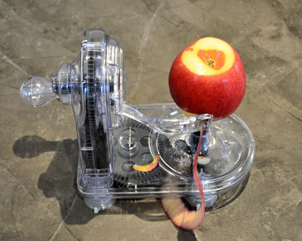 Ik heb een appel schiller. Je kan ook de appel (of peer 😉 ) op een snijplank met pinnen prikken en de appel zo schillen met een dunschiller.