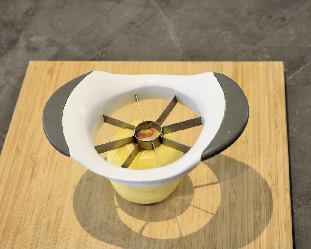 Als de appel geschild is, gebruik ik een appelsnijder om hem in stukken te snijden en de kern eruit te halen. Zorg ervoor dat de handvaten groot genoeg zijn, zodat je er voldoende kracht op kan zetten. (Bijboorbeeld: https://www.bol.com/be/nl/p/yono-appelsnijder-12-partjes-rvs-appeldeler-appelboor-rood/9300000146720444/?referrer=socialshare_pdp_www)