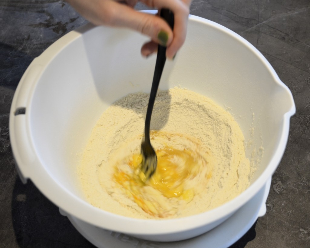Giet de eieren in het kuiltje bij de bloem en voeg de melk toe. Klop alles los en meng met de garde, tot het een lopend beslag is zonder klonters.
