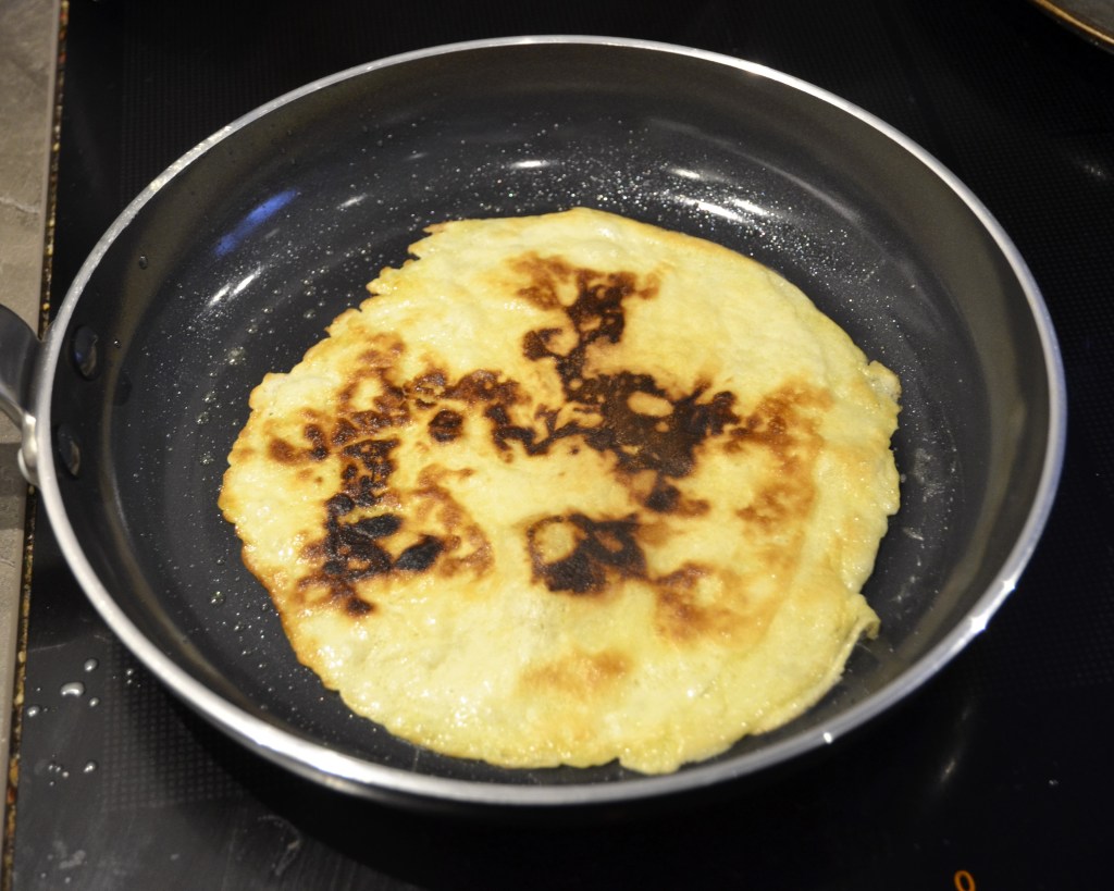 Giet wat beslag in de pan, zodat het beslag de volledige pan bedekt. Draai de pan even rond om een egale laag te krijgen. Laat staan tot de bovenkant opdroogt.