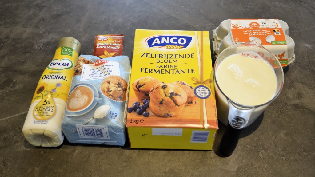 Zeef de bloem in de kom. Zet de kom op een antislipmat of in de staybowlizer, zo blijft die mooi stilstaan als je begint te mengen. Voeg de suiker en vanillesuiker toe en meng met de garde. Maak een kuiltje in de bloem voor de eieren en melk.
