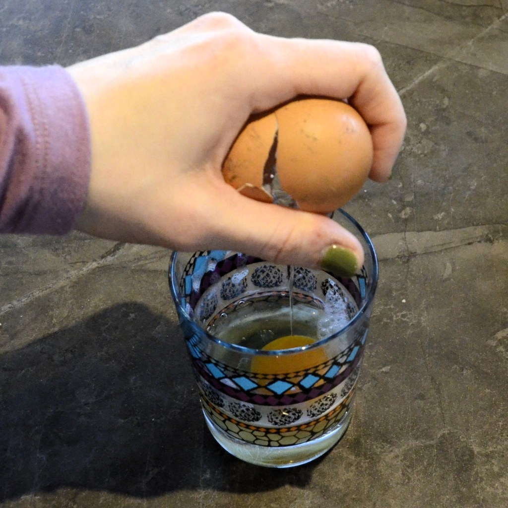 Breek je eieren in een glas. Zo kan je er gemakkelijk stukjes eierschaal uithalen.