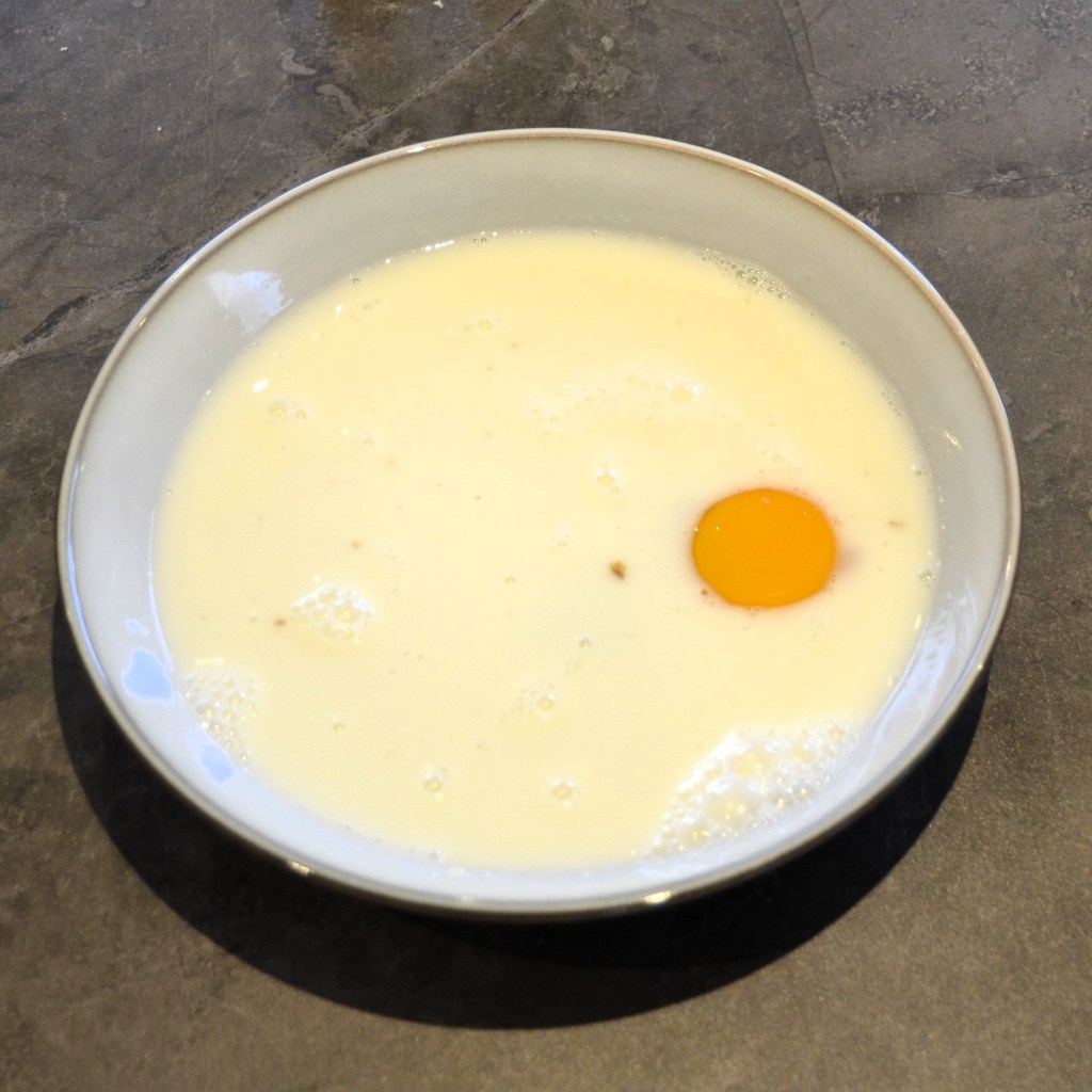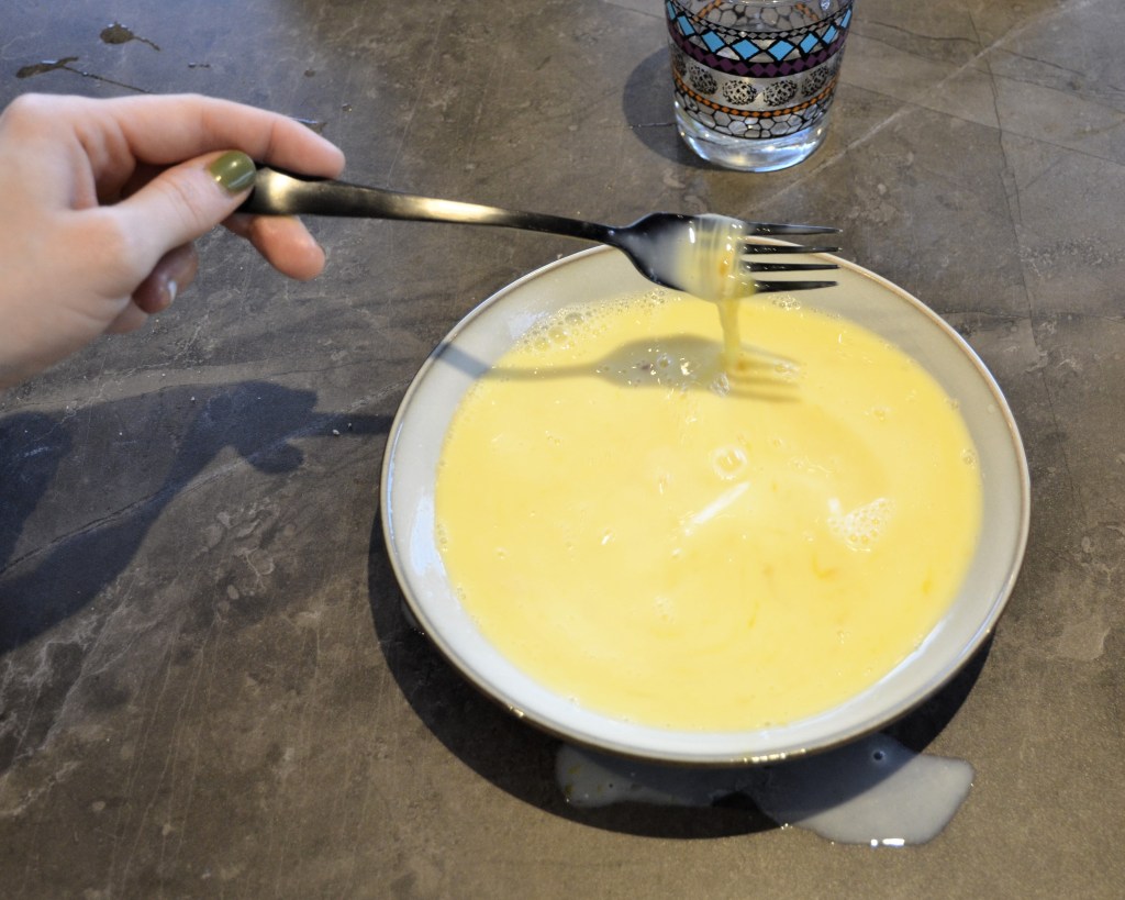 Doe je melk in een diep bord en kluts het ei eronder met een vork.