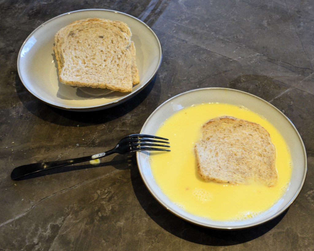 Leg een snee brood in het beslag en draai de snee vervolgens om in het beslag.