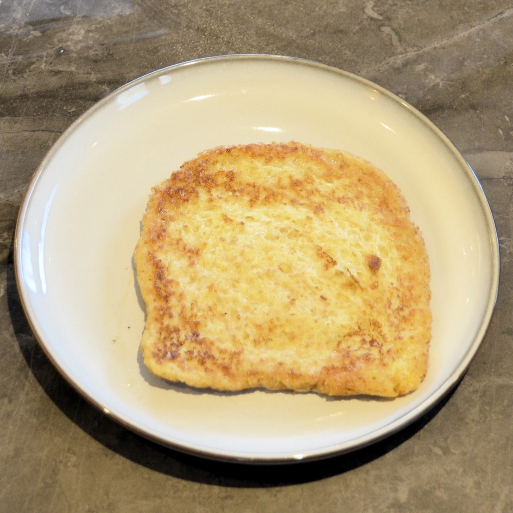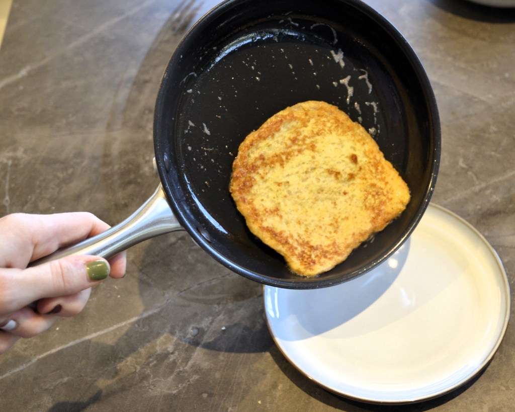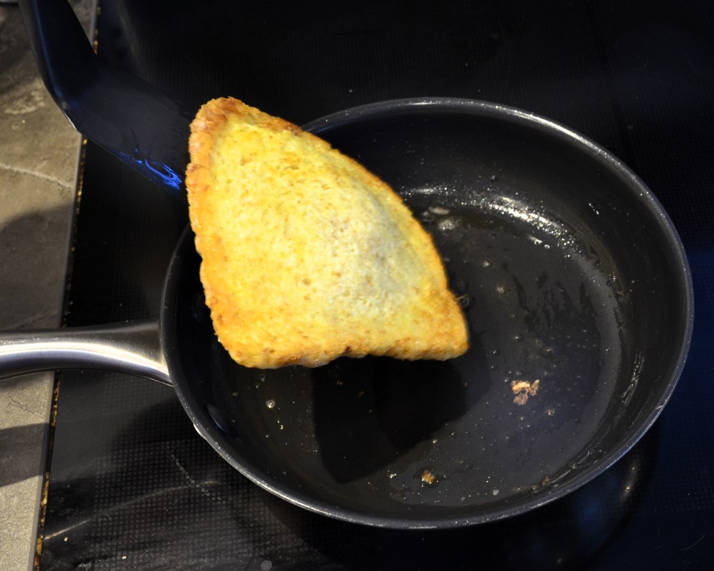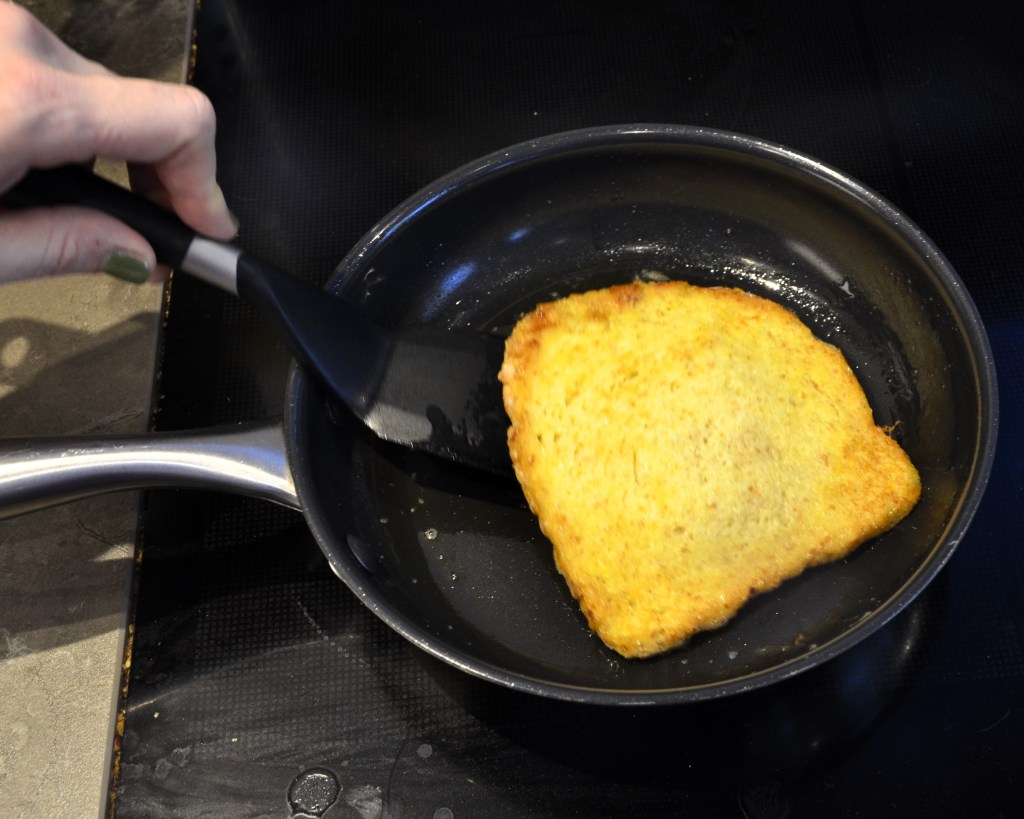 Herhaal dat met je andere sneden brood tot het beslag op is. Als je wil, kan je ook een grotere pan gebruiken en er dan meerdere sneden brood tegelijk bakken.
