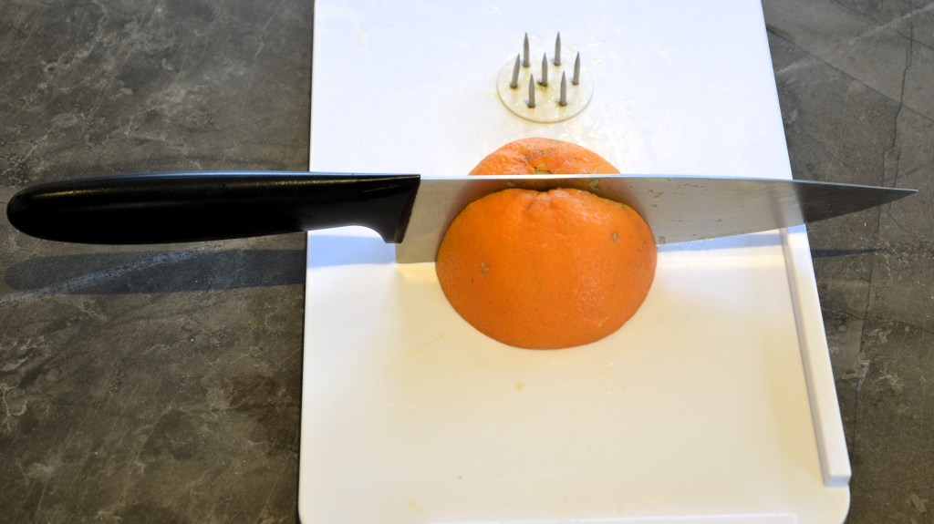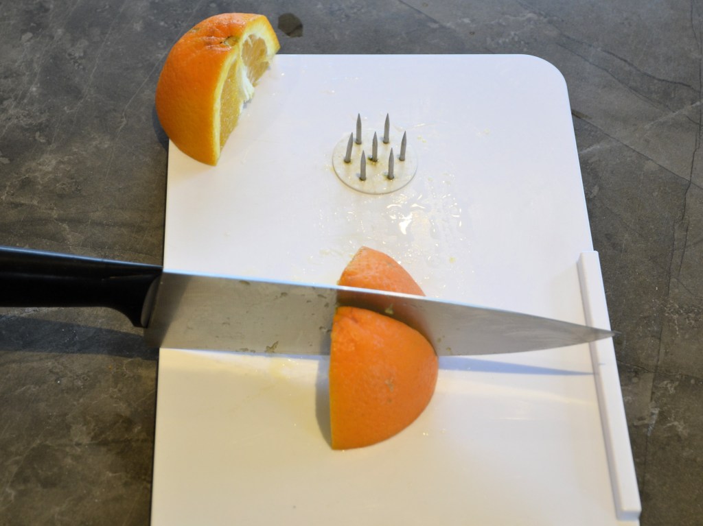 - Haal de twee helften van de pinnen en leg ze met de binnenkant naar onder op je snijplank. Dan heb je de pinnen niet nodig, want dan heb je een vlak oppervlak.