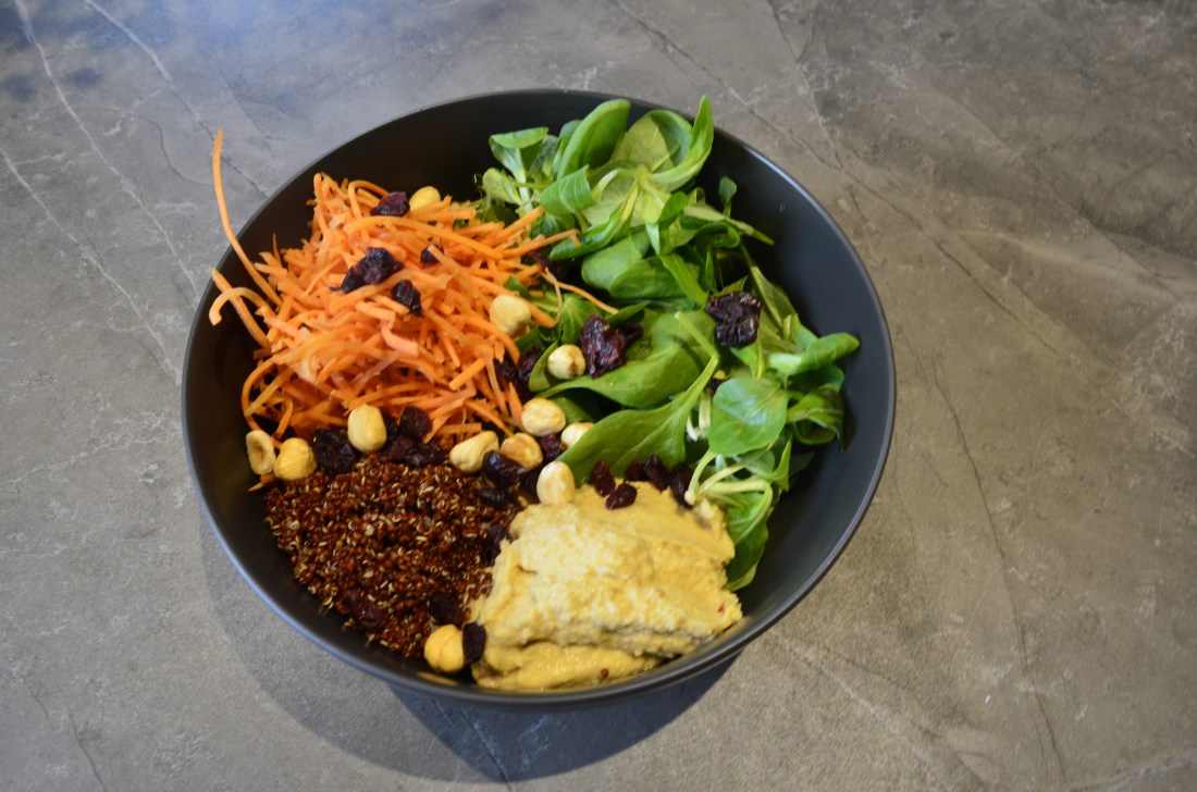 Deze bowl is eenvoudig te maken met kant-en-klare ingrediรซnten. De zoete gedroogde cranberries en knapperig geroosterde hazelnoten vullen elkaar goed aan. Je hebt voorgekookte of zelfgekookte quinoa, gekochte of zelfgemaakte hummus, geraspte wortel, geroosterde hazelnoten, gedroogde cranberries, veldsla en kruiden nodig. De voorbereidingstijd varieert van 5 tot 25 minuten en de montage duurt 5 minuten. Geniet!